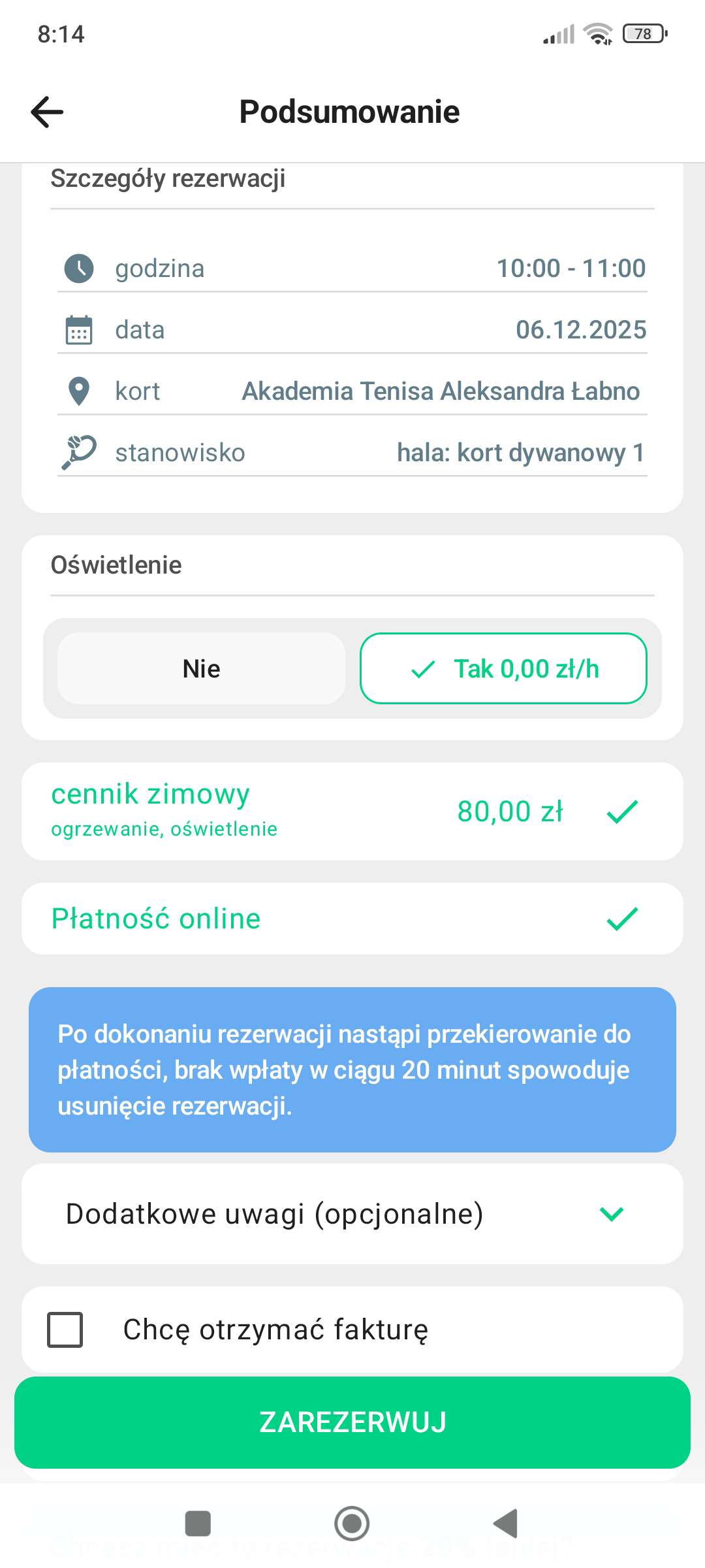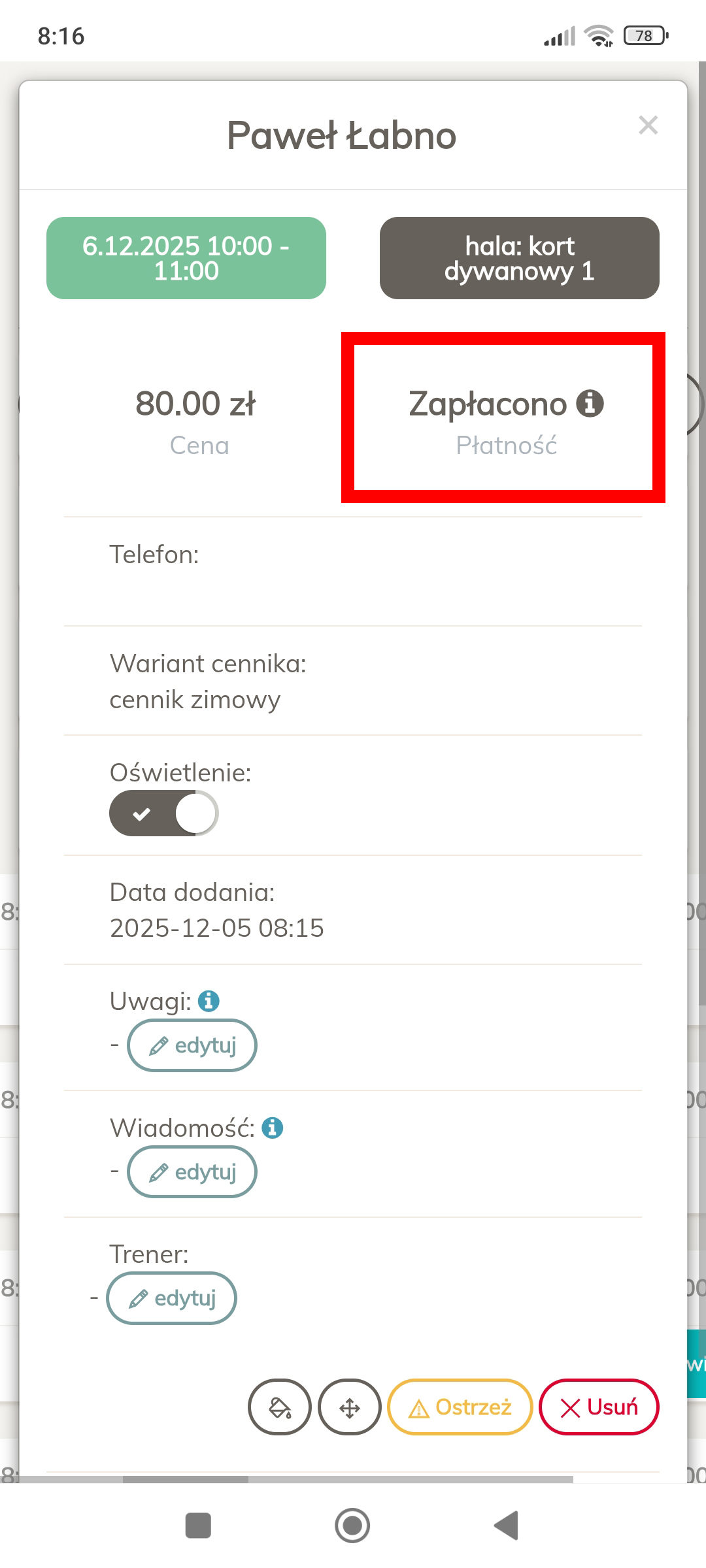 system musi widzieć rezerwację jako opłaconą