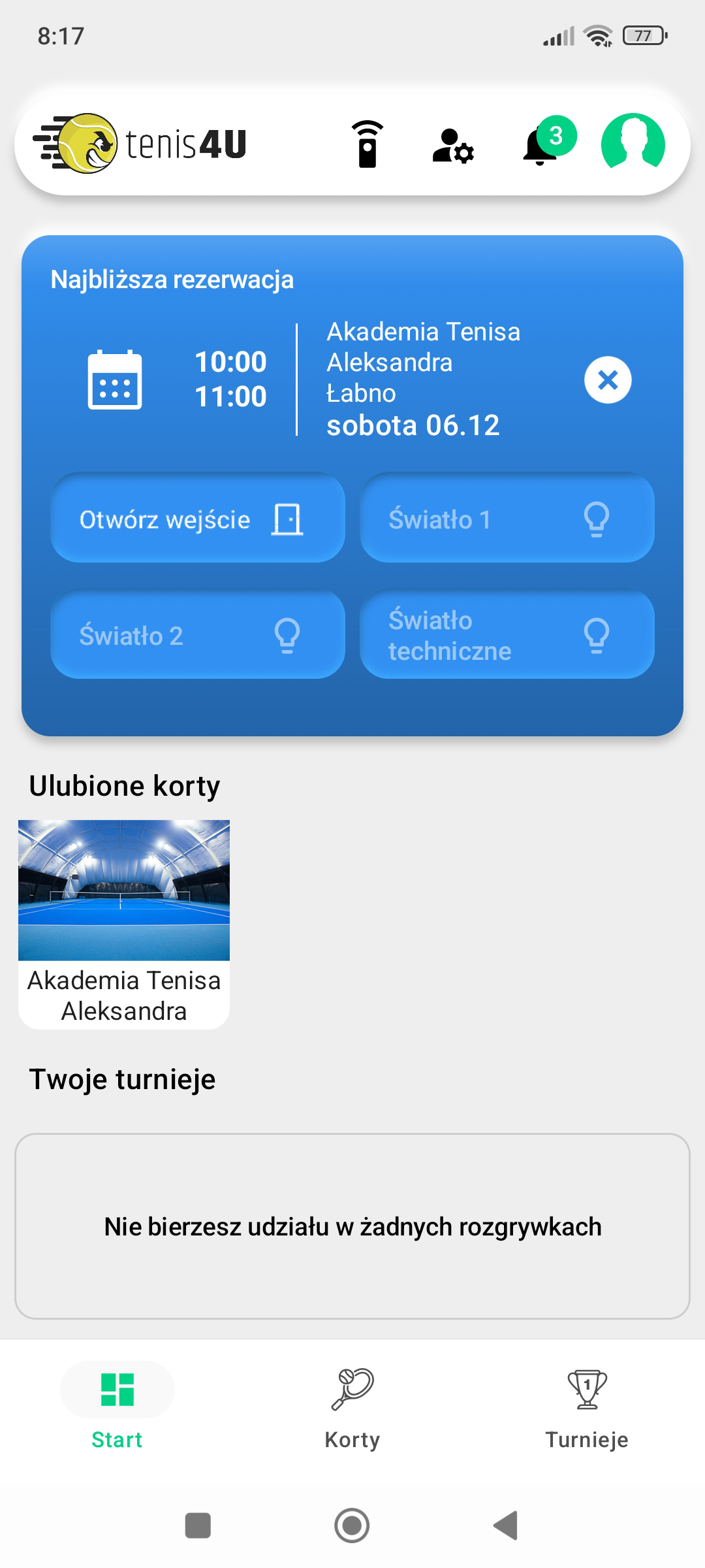 W celu rezerwacji online konieczne jest stworzenie konta w serwisie Tenis4u. Możliwość odwołania rezerwacji powyżej 24h przed terminem gry. Niestawienie się na rezerwację zobowiązuje do zapłaty za nią zgodnie z cennikiem.